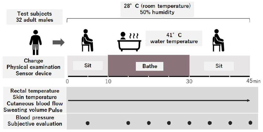 This experiment was carried out using 32 healthy males as test subjects. The environment of the test room was set at a temperature of 28°C and humidity of 50%, and the bathwater was set at a temperature of 41°C. The test subjects remained seated in the bathroom for 10 minutes from the start of the experiment, after which they relocated to the bathtub and remained in it for 20 minutes. They then got out of the bathtub and again remained seated for 15 minutes. The test subjects were also given a survey on their bathing habits to investigate their individual bathing approaches and durations.